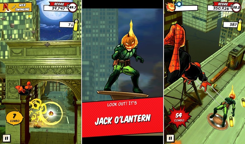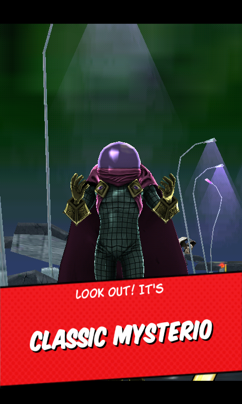 Mysterio is the sixth boss encountered during the missions of story mode. His attacks consist of floting eyes and enlarged fist thrown and placed throughout the battle. He has his own unique stage which is warped and has the only area where spidey can switch lanes while in webswing mode.